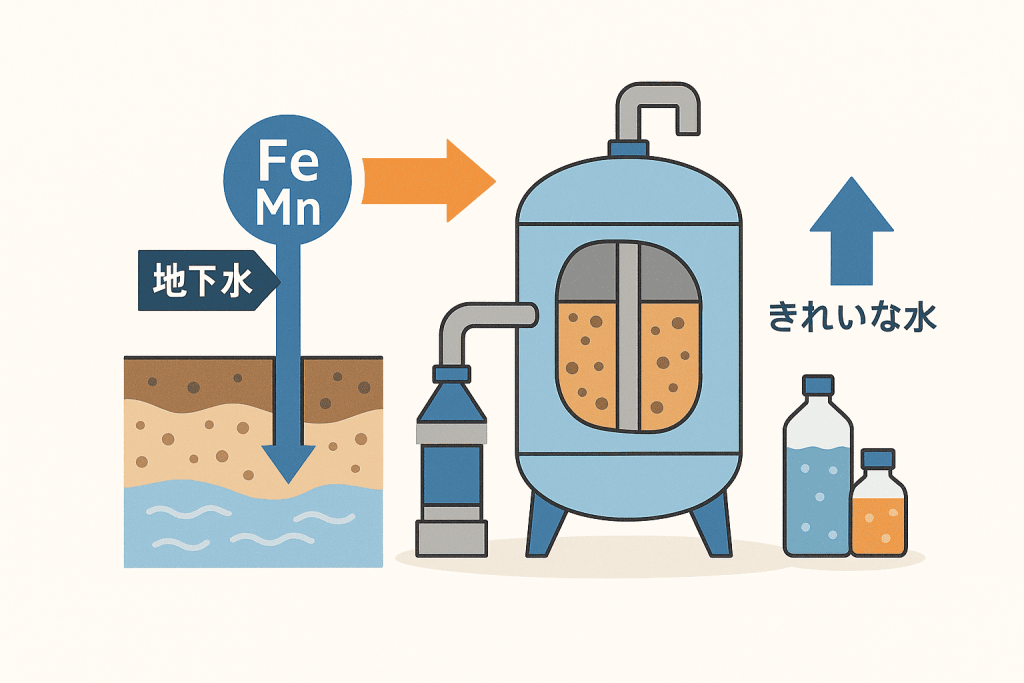 地下水に含まれる鉄やマンガンは、赤水や異臭の原因となります。当社では、現地水質分析に基づいた除去濾過器の選定と設置工事を行います