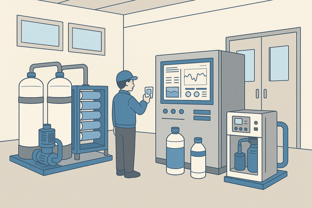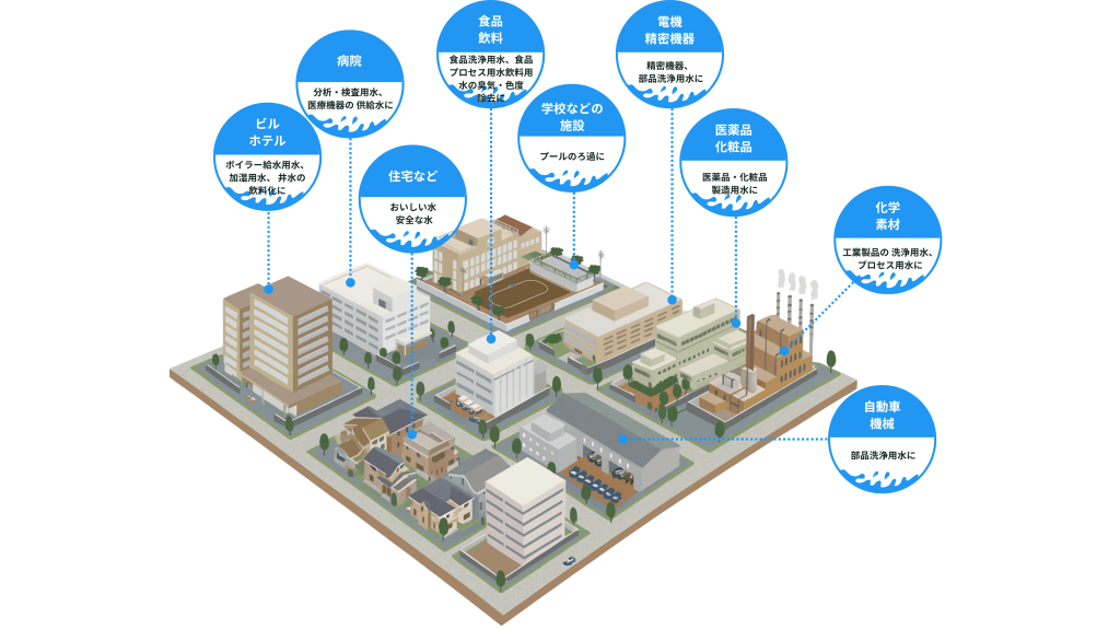 医療・半導体・研究施設などで求められる超高純度の水を供給する設備を構築します。用途や使用量に応じてRO膜・EDI装置などを組み合わせ、必要な水質レベルに対応。