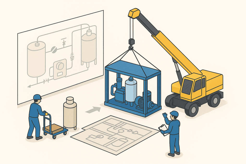 水処理装置、ポンプ、薬品注入装置、制御盤など、各種機器の搬入・設置・配線工事まで対応可能です。
