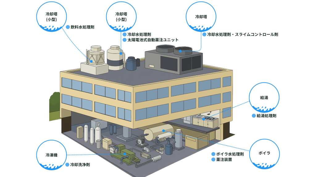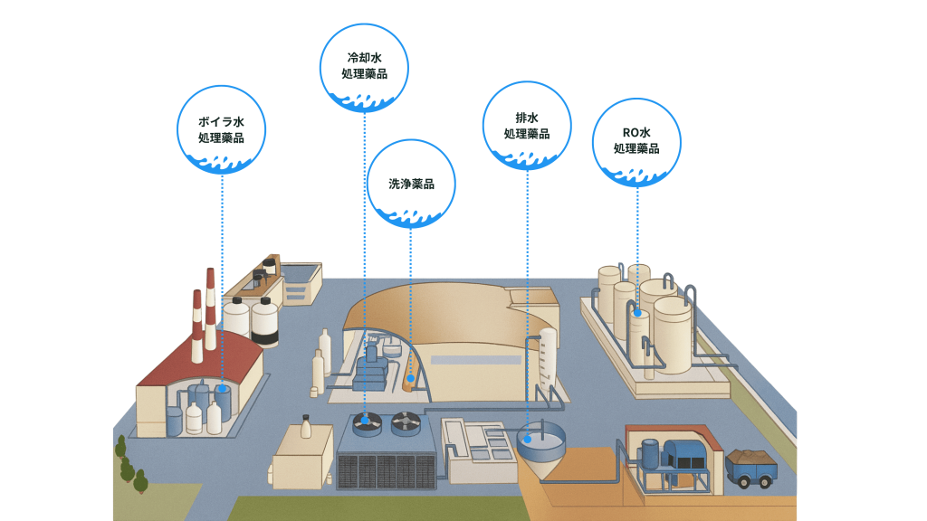 冷却塔やボイラー、RO膜処理装置、排水処理施設など、用途に応じた各種薬品を取り扱っています。
